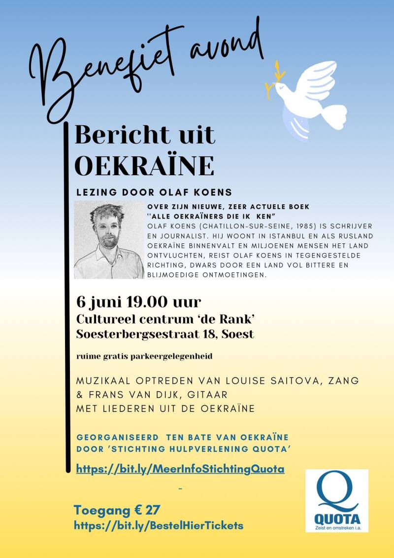 Dinsdag 6 juni organiseert Quota Zeist e.o. een benefietavond voor Oekraïne en ontvangt verslaggever en auteur Olaf Koens voor een lezing over zijn nieuwe actuele boek: ' Alle Oekraïners die ik ken'. Zijn lezing wordt muzikaal omlijst met liederen uit Oekraïne door Louiza Saitova (zang) en Frans van Dijk (gitaar).